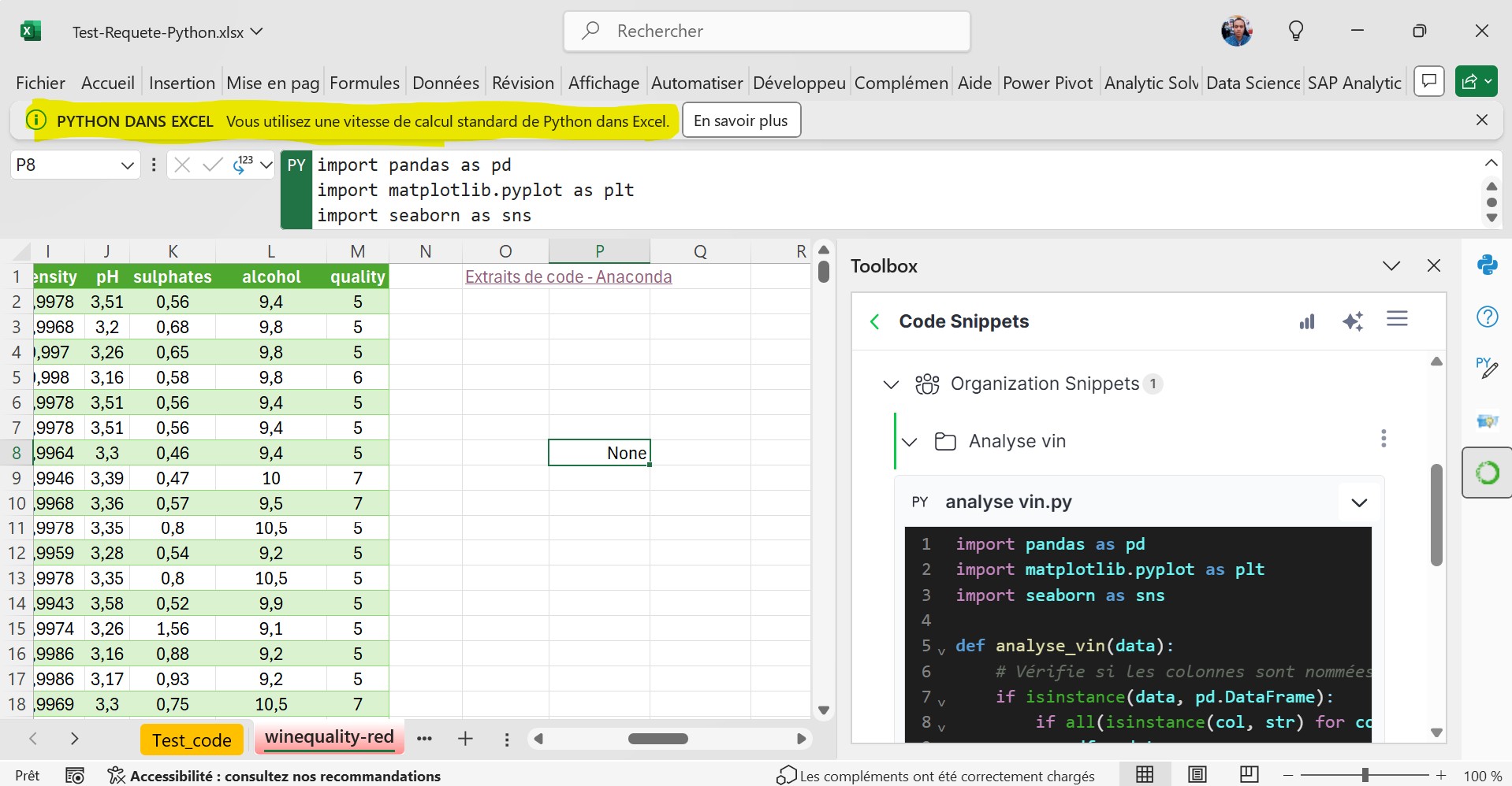 “ PYTHON DANS EXCEL vous utilisez une vitesse de calcul standard de Python dans Excel “ (see the yellow color)